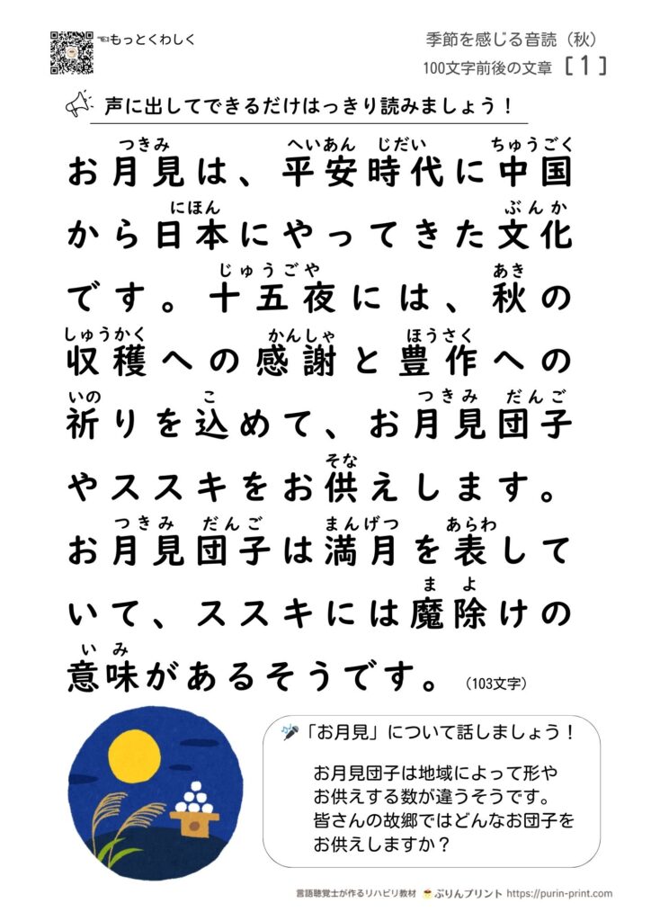 ぷりんプリントでは、お月見の雑学・豆知識を、100字位の文章にまとめたオリジナルのプリントをご用意しています。