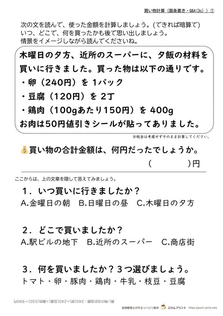 ・後半の「いつ、どこで、何を買ったか」の質問に答える際、本文を隠せば記憶課題となります。